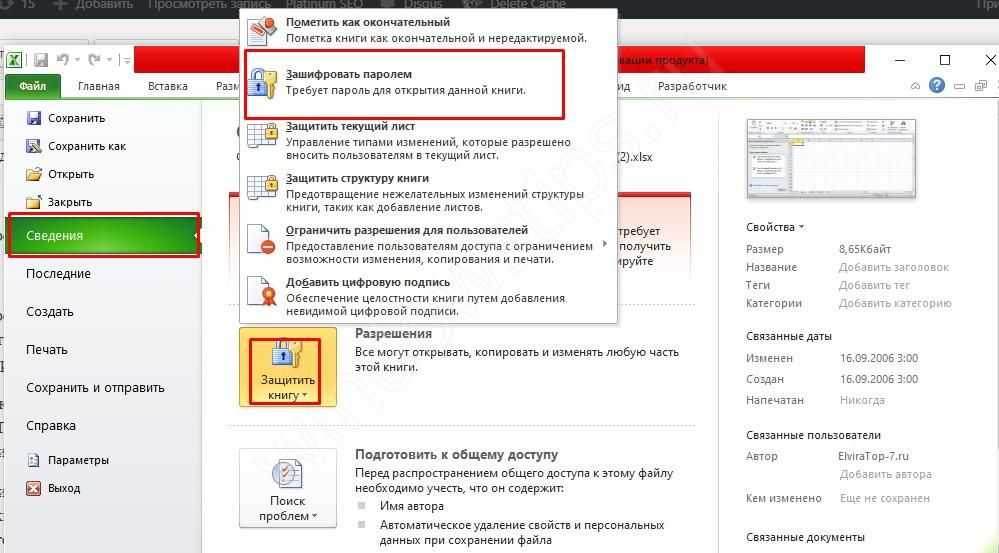 Установить пароль на файлы Эксель можно и без программ. Для этого откройте Excel документ. Нажмите левой кнопкой мыши в верхнем левом углу документа. Далее, выбираете из меню функции «Подготовить» и «Зашифровать документ». Дальше, остаётся придумать сложный пароль, и его сохранить (кнопкой ОК). Это самый простой способ установки пароля в Экселе.