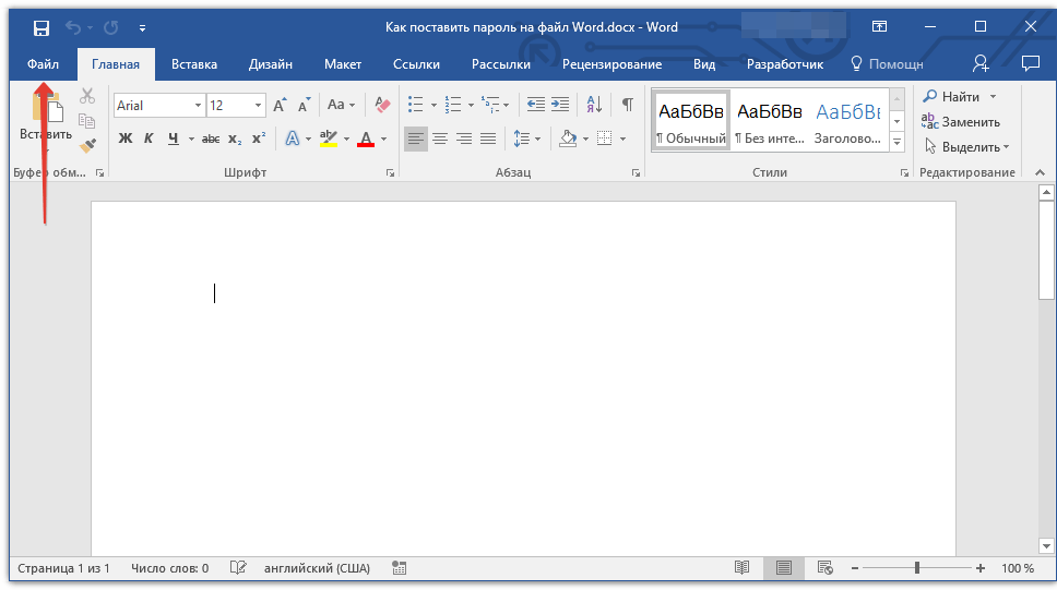 1. В документе, который требуется защитить паролем, перейдите в меню «Файл»