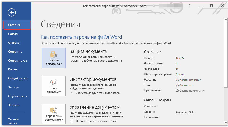 - Во вкладочке Файл находим строчку Сведения. Наводим мышь и выбираем пункт Защитить документ.