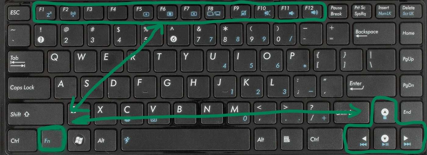 Но, их нужно нажимать вместе с клавишей Fn, которая обычно располагается в левой нижней части клавиатуры.