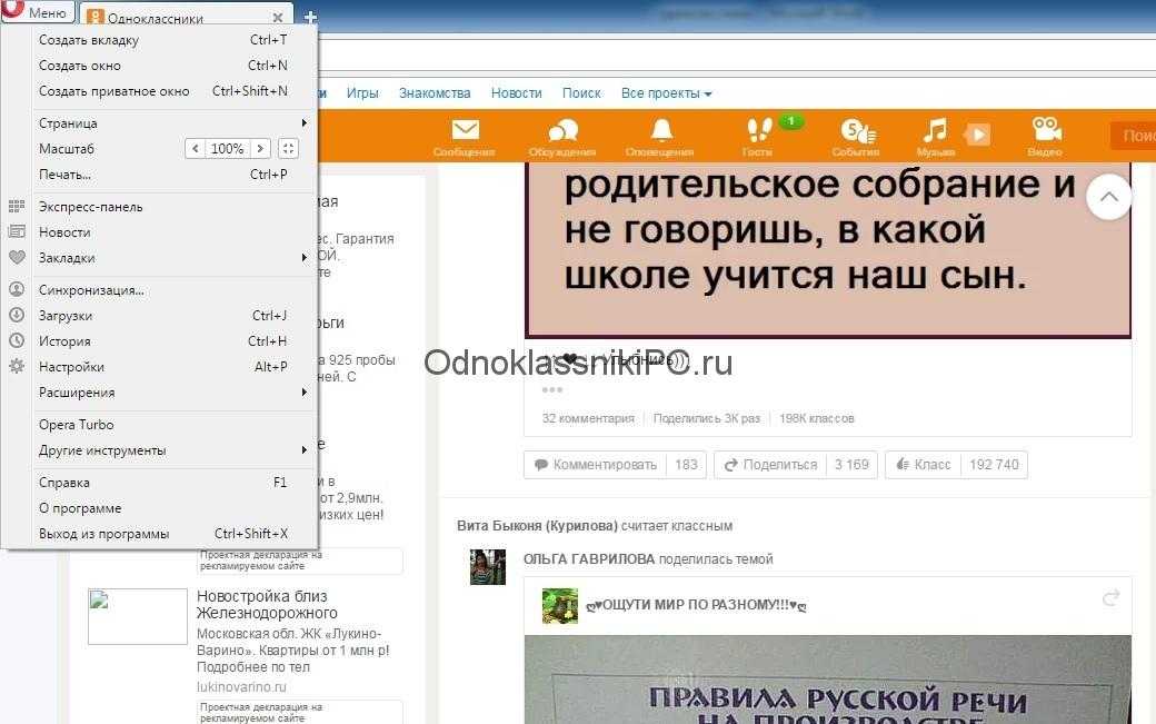 В Опере меню находится с другой стороны. Открываем его и видим кнопочки (мы обозначили их цифрой «2»). Именно они и настраивают масштаб Одноклассников. Точно так же, как и в Chrome, тут есть активация полноэкранного режима.