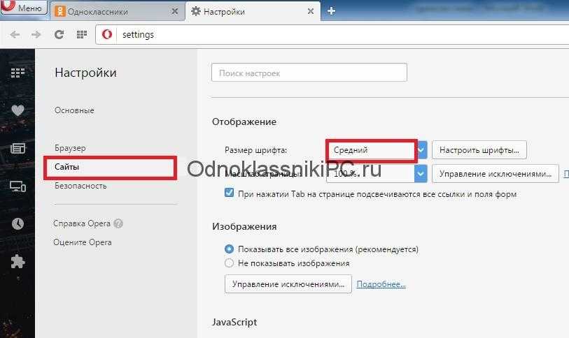 - Выбрать раздел «Настройки». Переходим на вкладку «Сайты», где можно увеличить как размер страницы в целом, так и только величину шрифта.