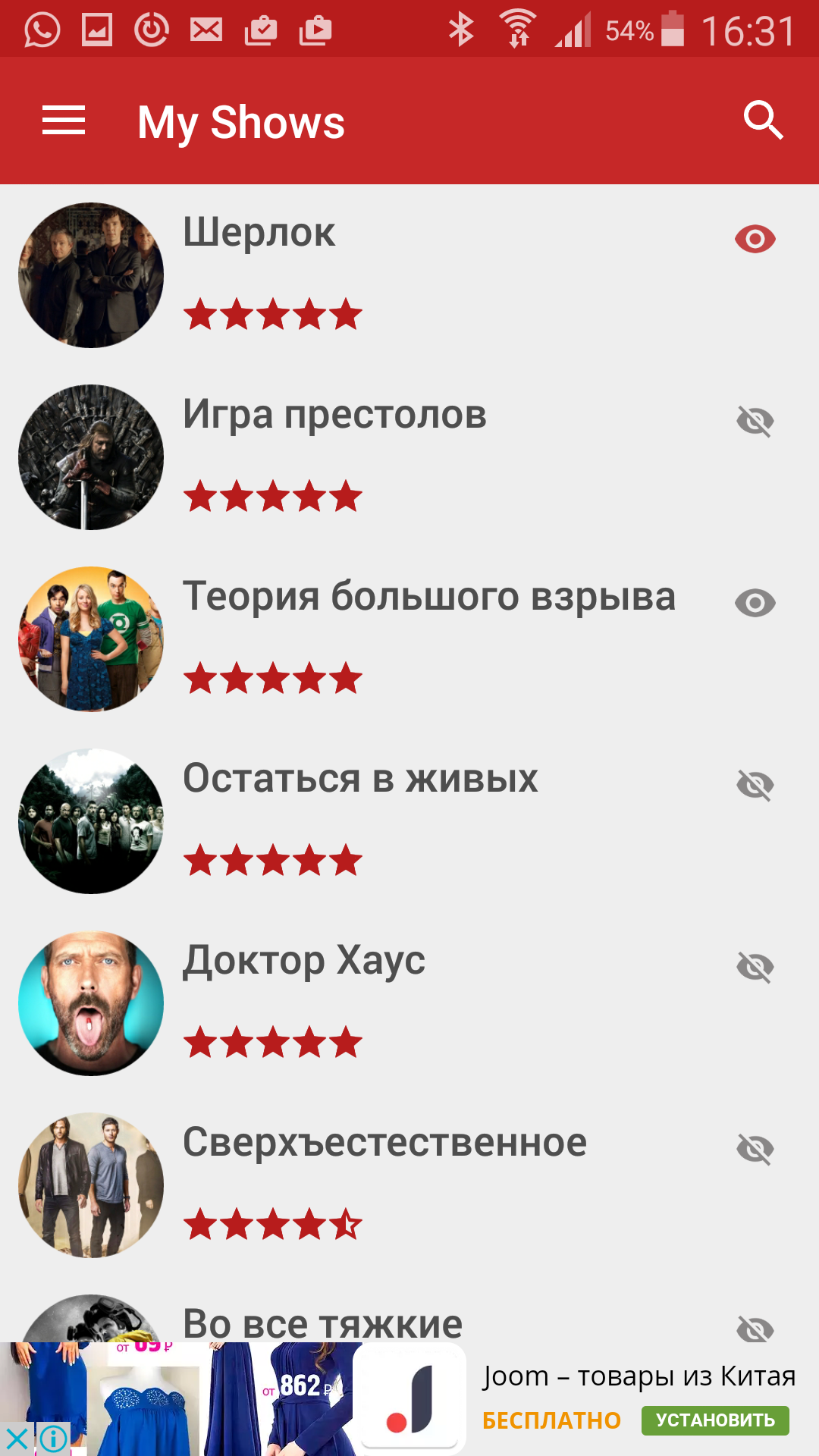 А теперь посмотрим внимательно на расчеты, которые мы производили только что. Они основаны на том факте, что разрешение, плотность пикселей и размер — величины взаимозависимые. И зная две из них, третью можно вычислить. Сделаем это для размера экрана. Для примера возьмем смартфон разрешением 1080×1920 (FHD) и плотностью пикселей 400 dpi. Такой экран будет иметь размер 2,7×4,8 дюйма. По теореме Пифагора можно вычислить диагональ. Она составит приблизительно 5,507 дюйма. Но, как мы уже выяснили, программная плотность пикселей составляет не 400, а 480 dpi. Следовательно с точки зрения прикладного ПО экран будет иметь размеры 2,25×4 дюйма, что дает диагональ всего лишь 4,6 дюйма! А если возьмем смартфон с разрешение 720×1280 (HD) и программной плотностью пикселей 320 (при физической 342), то получим точно такой же программный размер — 2,25×4 дюйма (и точно такую же диагональ в 4,6 дюйма). Т.е. устройства отличающиеся диагональю на 1,2 дюйма (что в таких размерах довольно много) с точки зрения прикладного ПО выглядят совершенно одинаково и на них помещается одинаковое количество информации. Просто на более крупном смартфоне все выглядит крупнее, но и только. Проиллюстрируем это скриншотами приложения My Shows со смартфонов Xiaomi Mi2s и Samsung Galaxy Note 3.