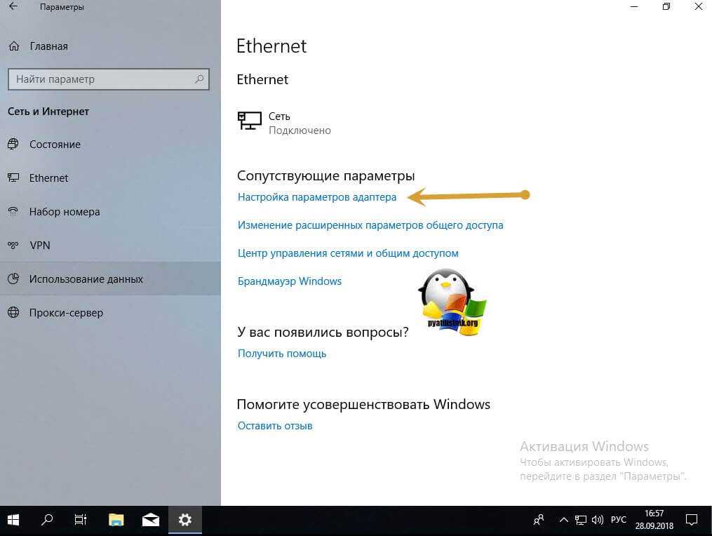 Кстати, если вы перейдете в пункт меню «Ethernet», то сможете от сюда попасть в настройки параметров адаптера и в «Центр управления сетями и общим доступом».