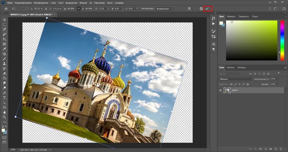 Чтобы сохранить снимок, воспользуйтесь комбинацией клавиш Ctrl+Shift+S, после чего укажите место для хранения и выходной формат. Есть еще одна возможность изменить наклон фото. Понадобится тот же инструмент трансформации (Ctrl+T).