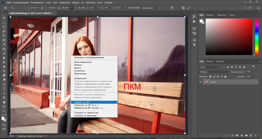 Далее при помощи комбинации клавиш Ctrl+T вызовите инструмент трансформации. Затем щелкните по картинке правой кнопкой мышки.