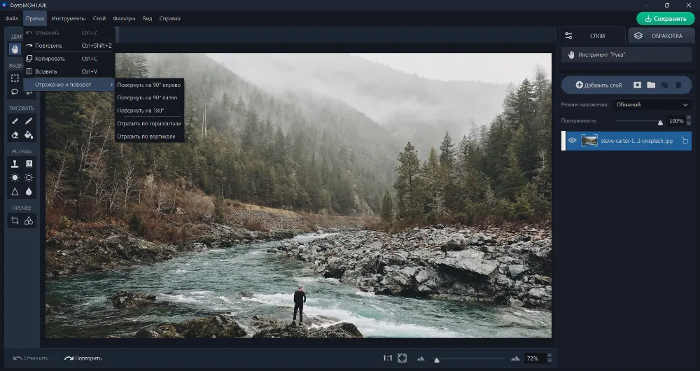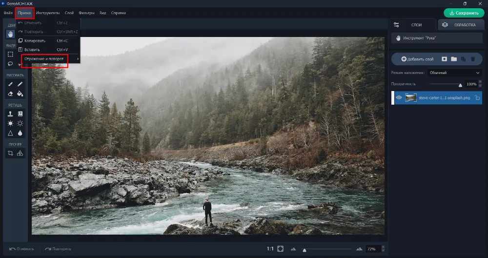 Далее загрузите желаемую картинку в редактор и откройте раздел «Правка». В выпадающем меню в самом конце списка найдите пункт «Отражение и поворот».
