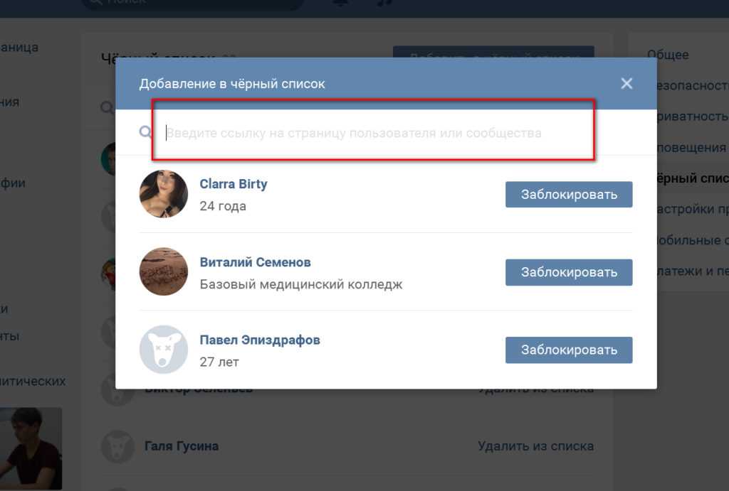 Откроется окошко с предложением ввести адрес страницы человека или группы, которых вы хотели бы добавить в список заблокированных.