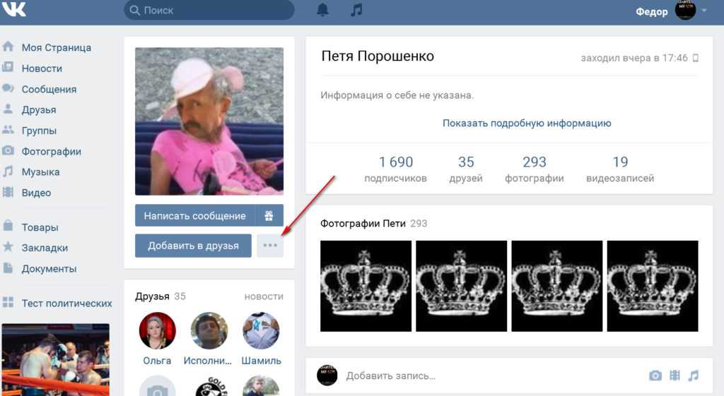- под его главной аватаркой найти кнопку «Добавить в друзья» и нажать на три точки, расположенные рядом с ней;