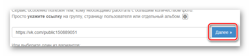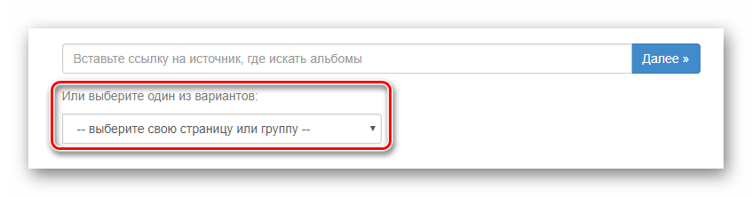 В специальное поле введите адрес пользователя или сообщества с которого необходимо закачать изображения, или выберите один из уже существующих вариантов, например, альбомы с вашей страницы. После чего кликните по «Далее».