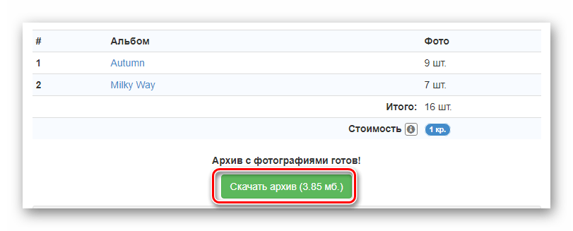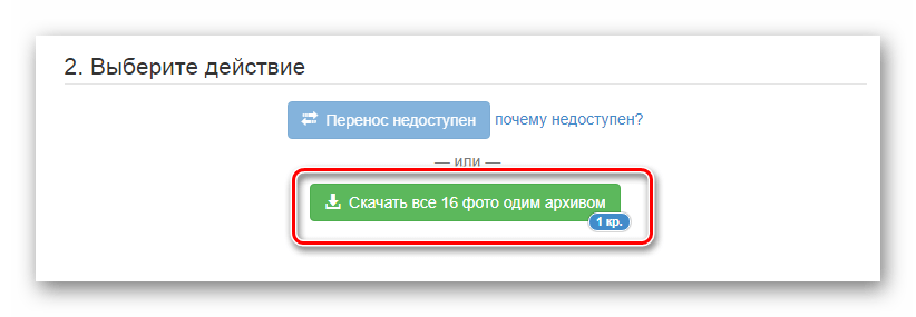 - В блоке «Выберите действие» кликните по кнопке «Скачать все фото одним архивом». Процесс скачивания, независимо от количества выбранных альбомов или фотографий, будет вам стоить ровно 1 кредит.