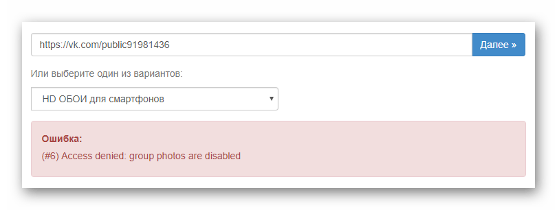 Обратите внимание, что в подавляющем большинстве при выборе какой-либо сторонней группы вы столкнетесь с ошибкой. Возникает она из-за настроек приватности выбранного сообщества ВКонтакте