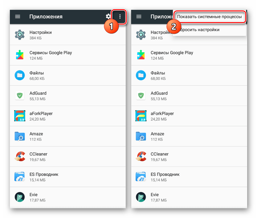 Дождавшись загрузки списка, нажмите по кнопке с тремя точками в правом верхнем углу и выберите пункт «Показать системные процессы». На более старых версиях Android достаточно будет перейти на страницу «Все».