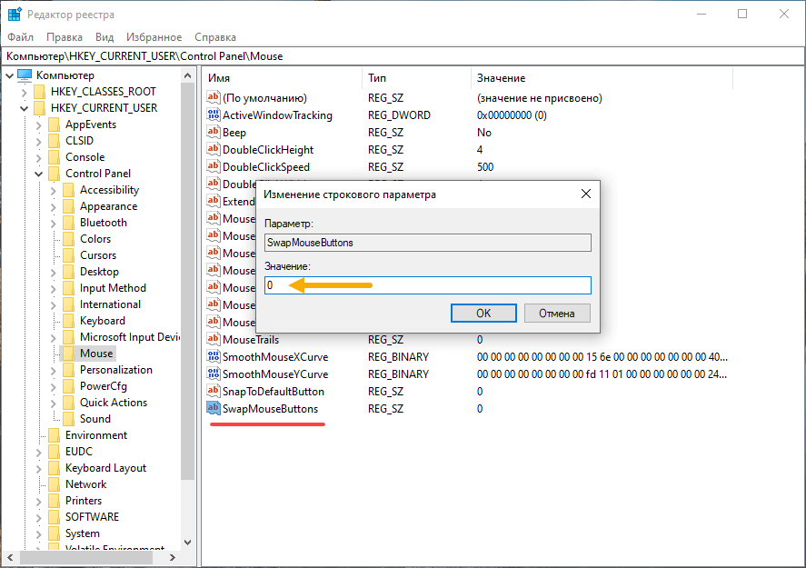 - Откройте параметр SwapMouseButtons и убедитесь, что значение установлено 0.