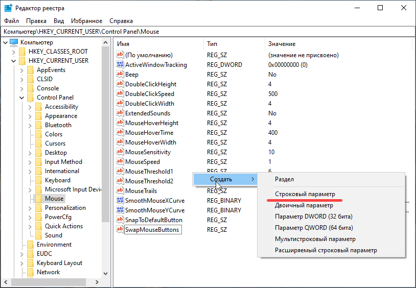 Не редкость, что ключа в разделе Mouse вообще нет. Тогда исправим это его созданием. Нажмите на пустом месте правой кнопкой мыши и выберите: создать – «Строковый параметр». Называем его SwapMouseButtons и в поле «Значение» вписываем 0.