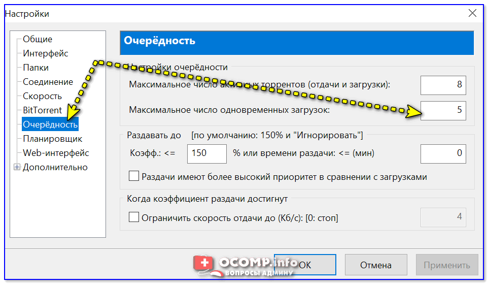 uTorrent — макс. число одновременных загрузок