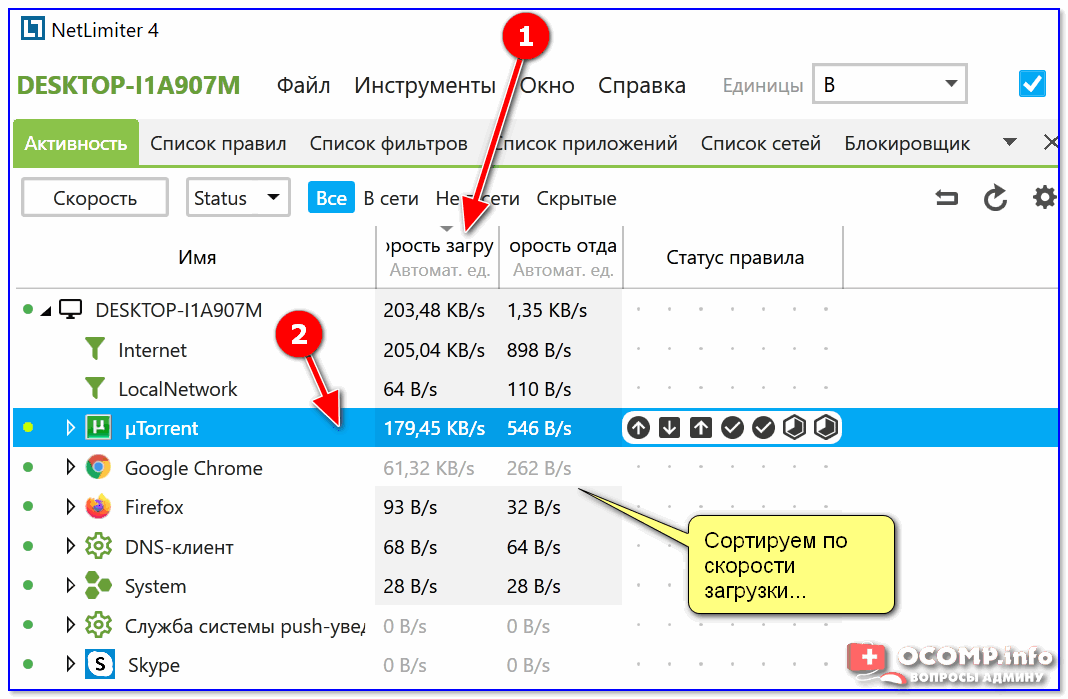 Сортируем по скорости загрузки — NetLimiter