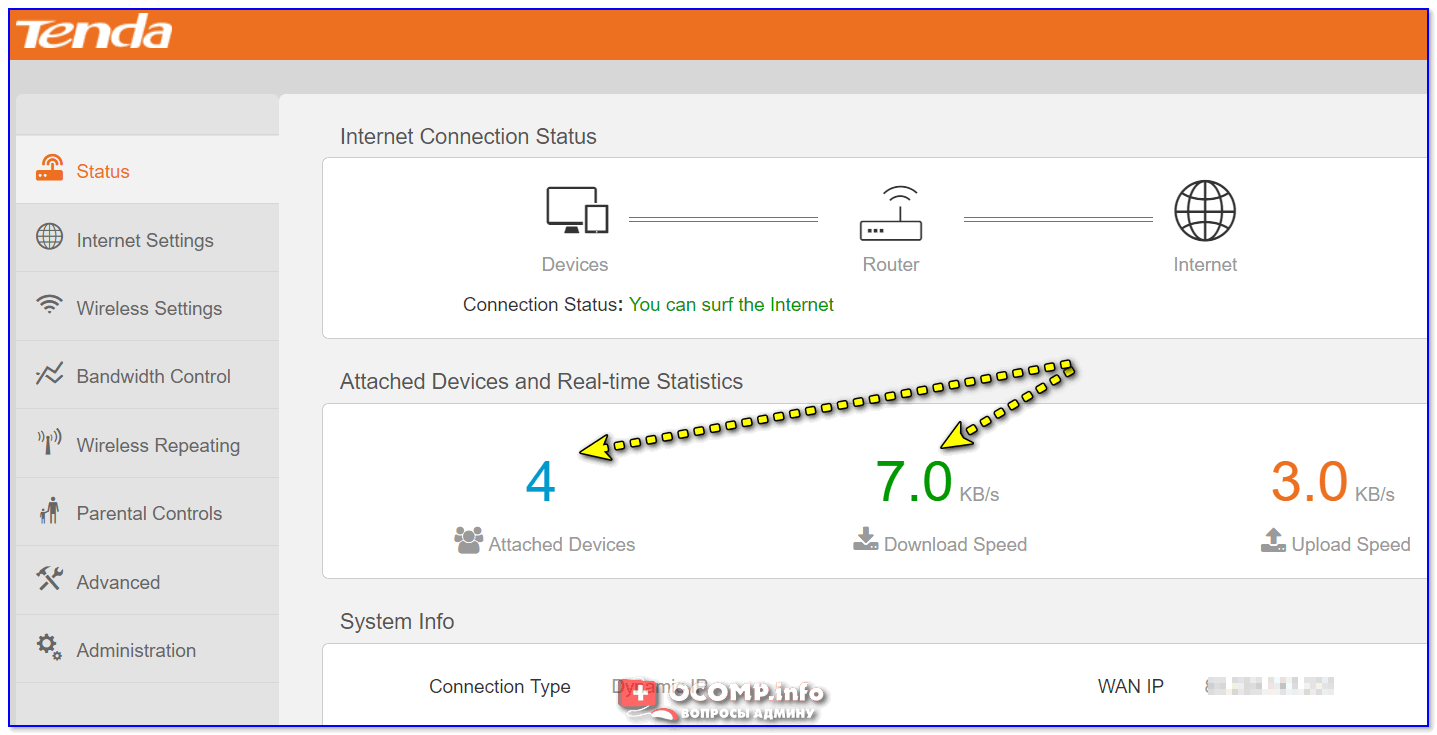 Чтобы посмотреть сколько устройств подключено к роутеру — необходимо открыть его веб-интерфейс (настройки). Пример приведен на скрине ниже: подключено 4 устройства.