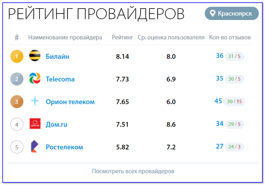 Если скорость и стабильность доступа к Интернет у вашего провайдера часто «хромает» — возможно стоит задуматься о его смене… В этом плане удобно пользоваться спец. рейтингами провайдеров (например, https://provayder.net/), где, выбрав свой город — можно просмотреть отзывы о качестве предоставляемых услуг.