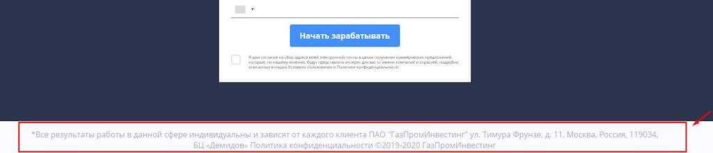 В качестве официального сайта брокера указан Gazprominvest-official.ru. Это — шаблонный одностраничник, который всеми силами пытается выглядеть солидным и серьезным.