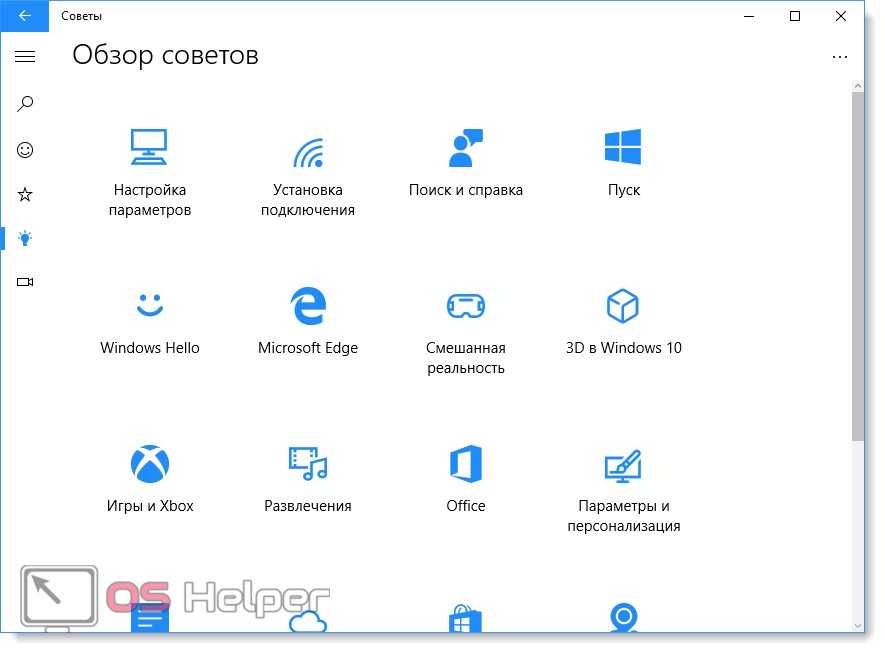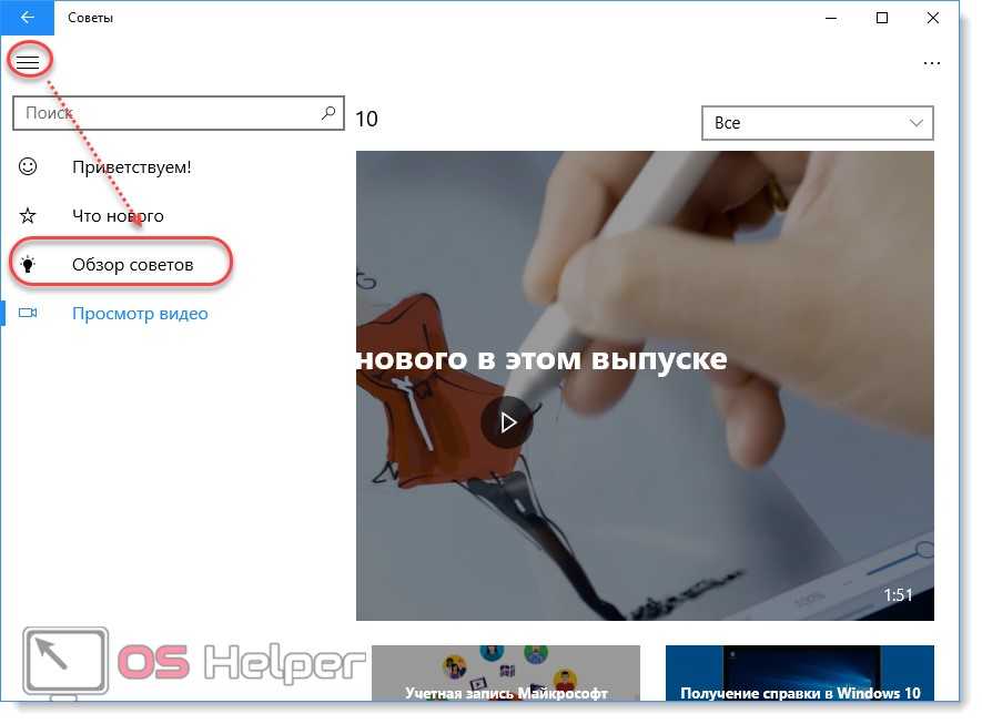 - Чтобы получить инструкцию по работе с Windows, кликните по иконке «Показать меню» и в появившемся списке – на «Обзор советов».