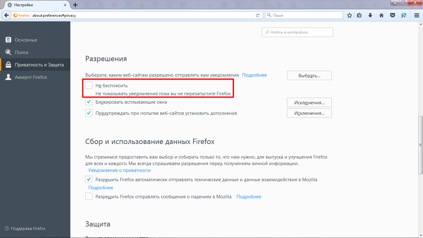 Отключение push-уведомлений в браузере Mozilla Firefox