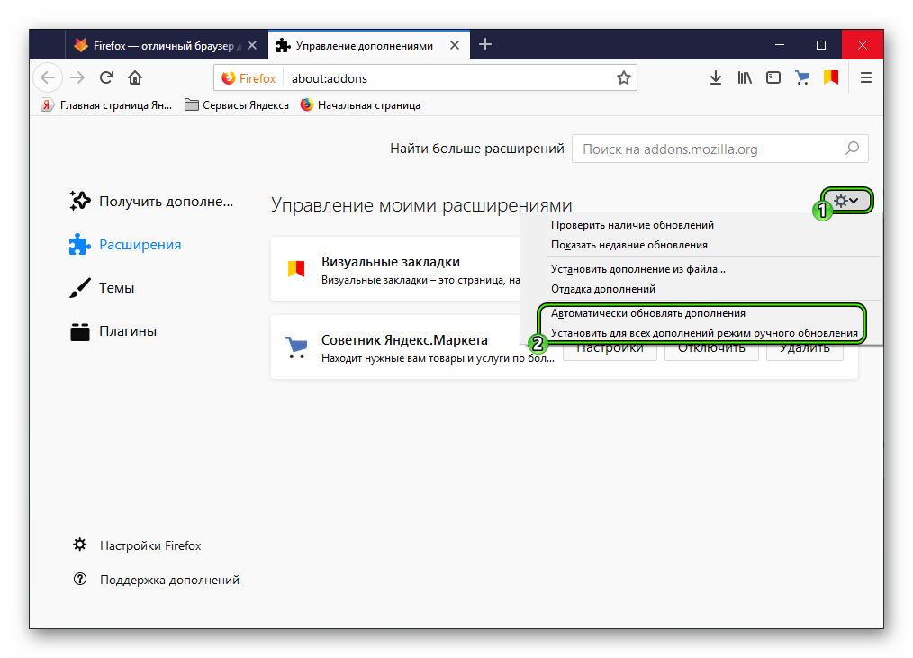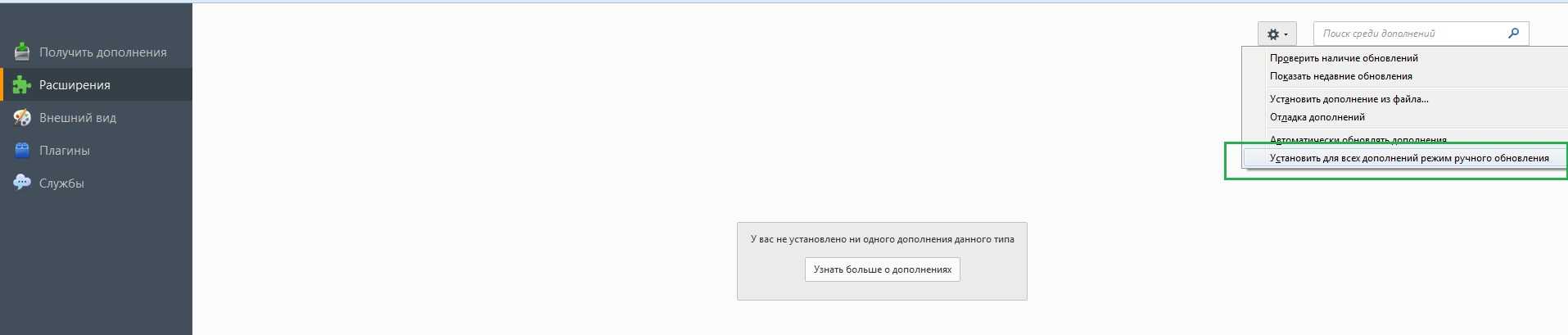 Также можно нажать Установить для всех дополнений режим ручного обновления.