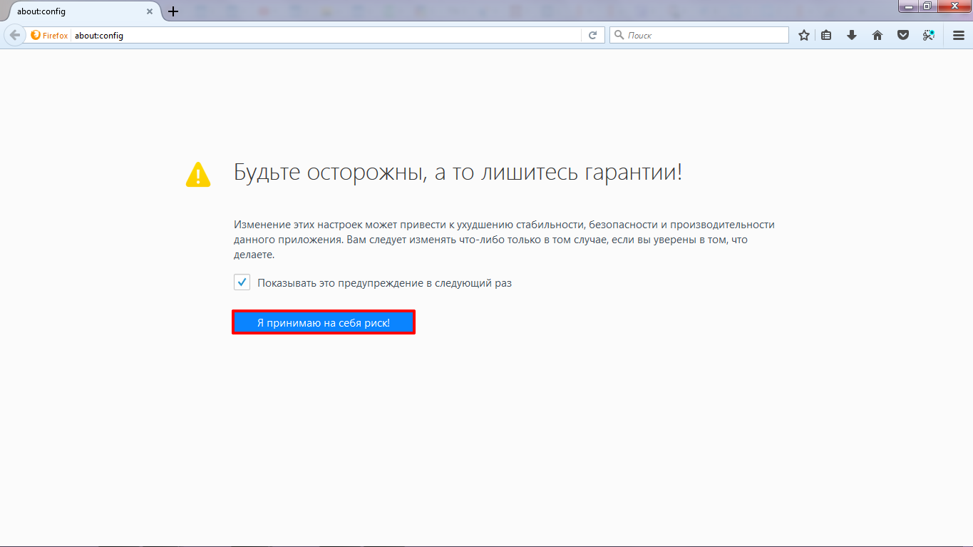 Введите about:config в адресной строке Firefox и нажмите Enter. Появится предупреждение, просто нажмите «Я принимаю на себя риск!», чтобы продолжить.