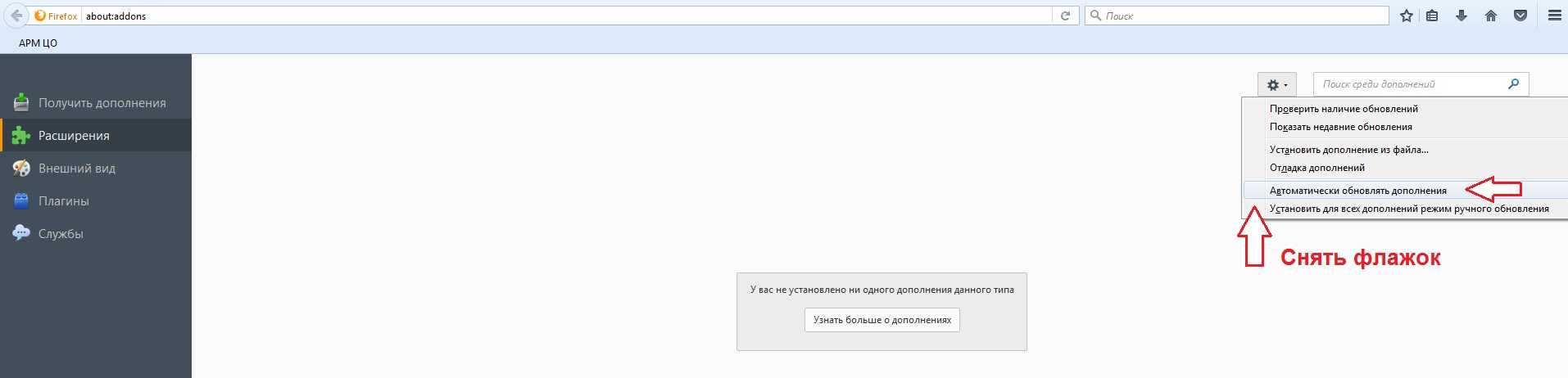 В меню Расширения в правой его части снимаем флажок с параметра Автоматически обновлять дополнения. Возможно этот пункт и не играет особой роли при решении проблемы как отключить обновление мозиллы, но для верности стоит это сделать, тем самым, чтобы ни версия браузера, ни любые его расширения больше не обновлялись.