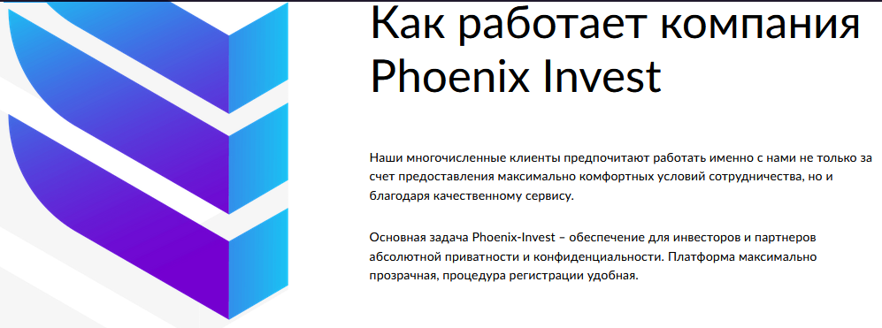 Своей главной задачей Phoenix-Invest называет обеспечение клиентов и партнеров абсолютной конфиденциальностью и безопасностью. Свою платформу жулики называют совершенно прозрачной и удобной.