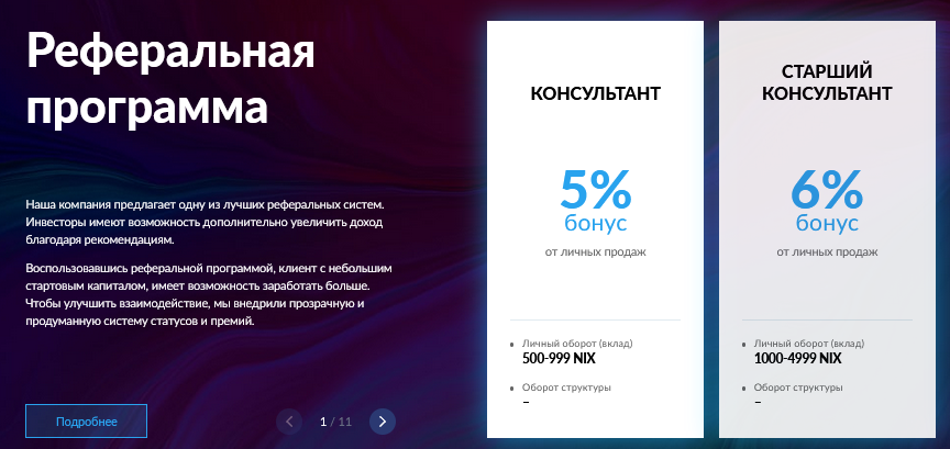 - Senior Program (высший). Уровень доходности — 1.48% в день. Сумма депозита должна быть не менее 6 000 NIX, то есть минимум $6 000. Инвестиционный период составляет 201 день. Суммарная доходность за весь срок равна 297.48 % (при минимальном депозите 6 000 NIX сумма к снятию достигает 17848.80 NIX).