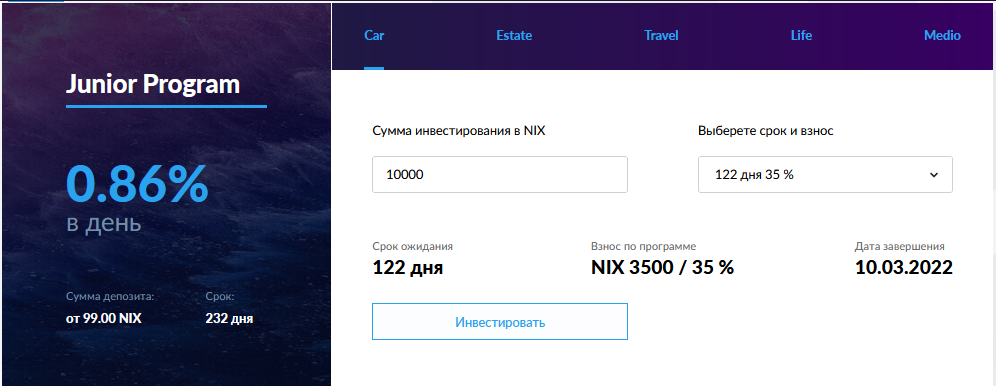 - Junior Program. Доход 0,86% в день, сумма депозита — от 99 NIX (собственная валюта компании), срок вклада — 232 дня.