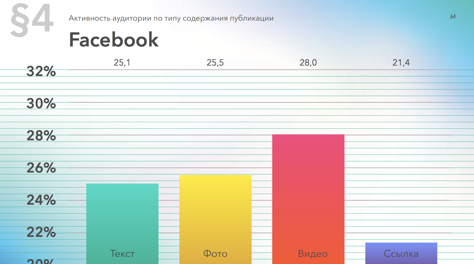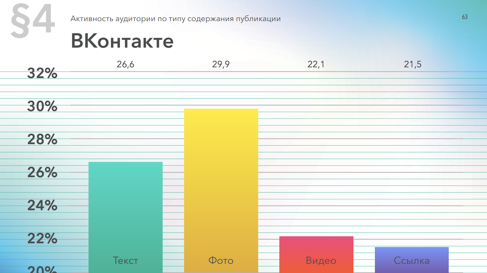 В лидируют посты с видео, а самая меньшая доля вовлеченности у публикаций с ссылками. За год разрыв между публикациями с видео и другими форматами заметно сократился.