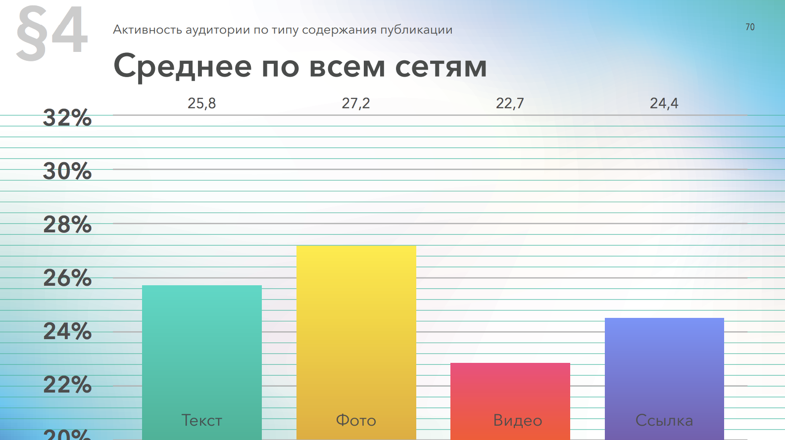 В больше всего вовлеченности на постах с фото, меньше всего — на публикациях со ссылками.