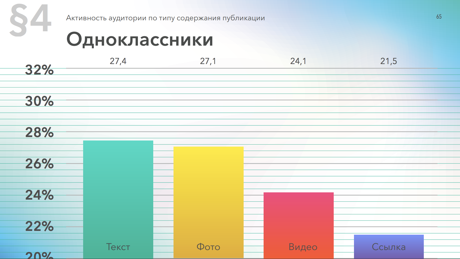 Посты со ссылками получают меньше всего реакций и в Одноклассниках. Лидируют здесь записи с текстом, а фото обгоняет видео по вовлеченности.