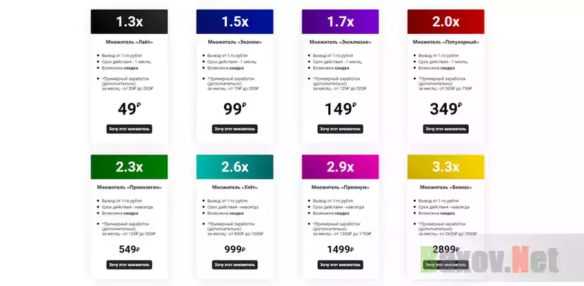 Но рефералов также можно покупать. Стоят они от 49 рублей до 2899 рублей в месяц. Прибыль обещают от 30-200 рублей в месяц (при покупке дешёвого пакета) до 2600-7000 рублей в месяц (при покупке дорогого). Прохиндеи даже не скрывают, что реферальный базар – убыточный.