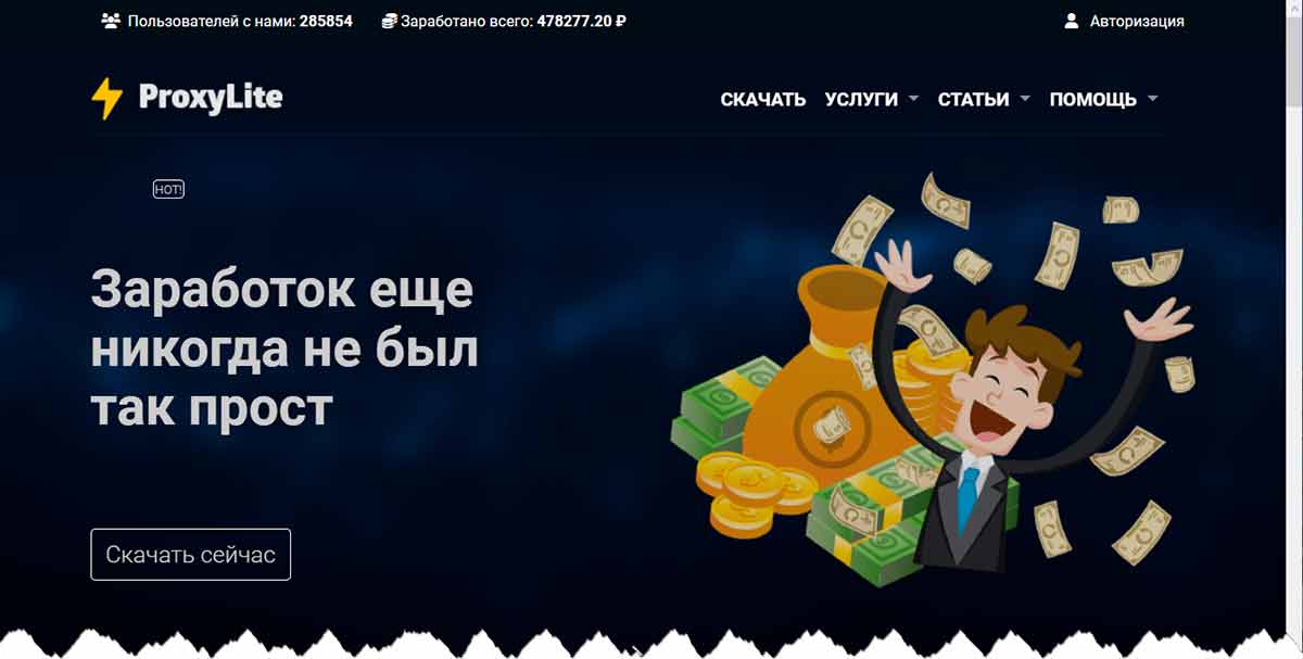 Первым делом мы зайдём на сайт данного сервиса и посмотрим, что там имеется. Сайт располагается по адресу proxylite.ru . На главной странице нас встречает сообщение, что заработок ещё никогда не был так прост. И справа красуется изображение со счастливым человеком, который фактически усыпан деньгами.