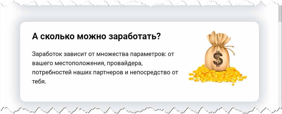 Неужели тут такие высокие заработки? Давайте это узнаем. Чуть прокручиваем страницу и видим, что абсолютно никакой конкретной информации в части заработка нет! Указывается лишь, что это зависит от множества факторов!