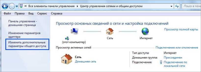 На левой панели щелкните на вкладку «Изменить дополнительные параметры общего доступа».