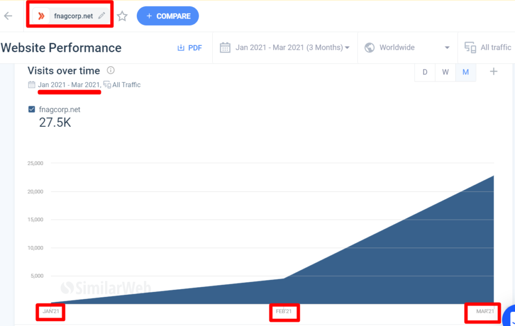 В подтверждение наших слов, что этот лохотрон начал активную деятельность только в начале 2021 года, является следующее изображение с сервиса веб аналитики трафика, на котором отчетливо видно когда на сайт начали заходить первые пользователи. И с какой активностью растет их количество.