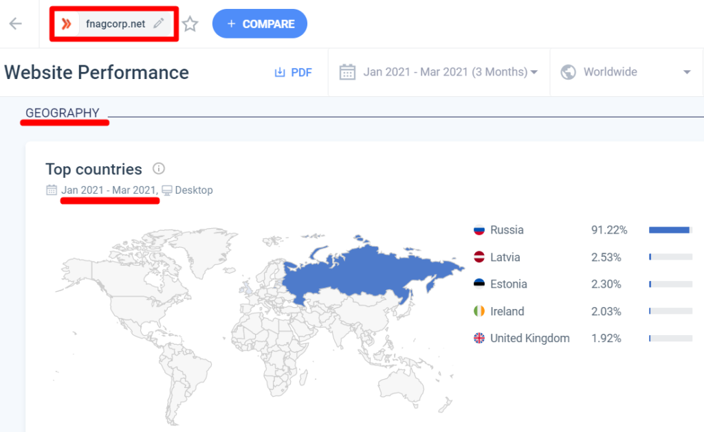 Теперь выясним, как же мошенники ищут потенциальных жертв и с помощью каких источников ведут их на свой сайт. Ниже мы можем увидеть, откуда идет реферальный трафик на сайт мошенников fnagcorp.net