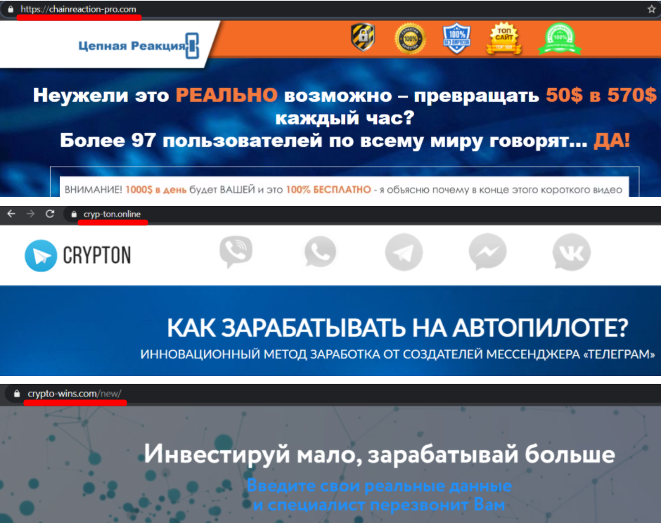 Взглянув на контент этих сайтов, сразу становится понятно, с какой целью они были созданы. Такие броские лэндинги создаются и рекламируются для получения контактных данных людей, которые ищут в интернете способы дополнительного дохода. Эти люди верят в то, что можно зарабатывать на автопилоте или инвестировать мало, а зарабатывать много, ну или же превращать 50$ в 570$ каждый час. Для мошенников это идеальные клиенты.