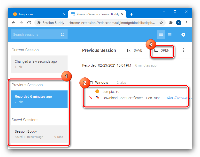 Расширенные возможности сохранения вкладок реализованы посредством разнообразных плагинов и аддонов. Большинство современных браузеров поддерживают дополнения, поэтому работу с ними покажем на примере Google Chrome и решения SessionBuddy.