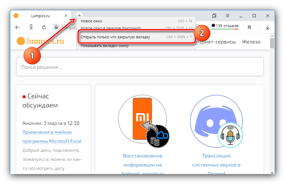 - Наиболее простой и примитивный способ – восстановление всех вкладок по одной, комбинацией клавиш Ctrl+Shift+T. Также эту функцию можно задействовать, кликнув правой кнопкой мыши по элементу открытия новой страницы и выбрав соответствующий пункт в контекстном меню.