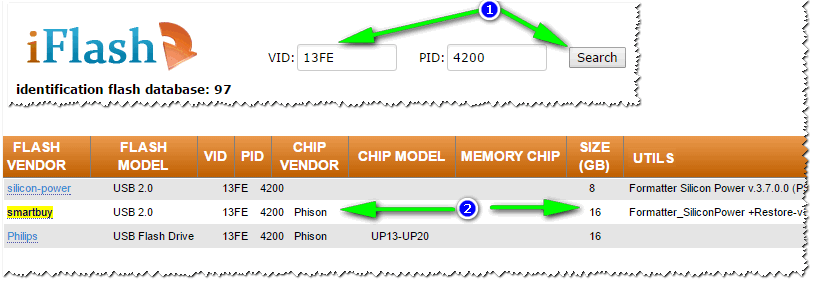 По полученным значениям для VID и PID, подставленным в окне базу данных определяется контроллер и программа (UTILS) для прошивки флешки: