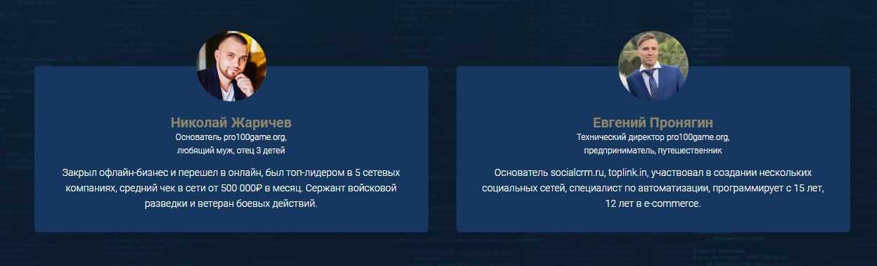 На официальном сайте pro100game основателями проекта являются Николай Жаричев — топ-лидер сетевых компаний с заработком 500.000 рублей в месяц, а также предприниматель и путешественник Евгений Пронягин, на которого и оформлена индивидуальное предпринимательство о чем указано в пользовательском соглашении.