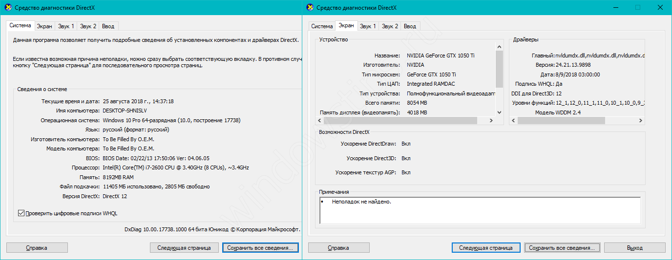 Откроется «Средство диагностики DirectX», где вся информация будет разделена по вкладкам. Система – данные о системе, ЦП, оперативной и виртуальной памяти. Экран – информация о видеокарте и драйвере. Звук 1 и Звук 2 – звуковая карта и устройство вывода. Ввод – клавиатура, мышь и другие манипуляторы.