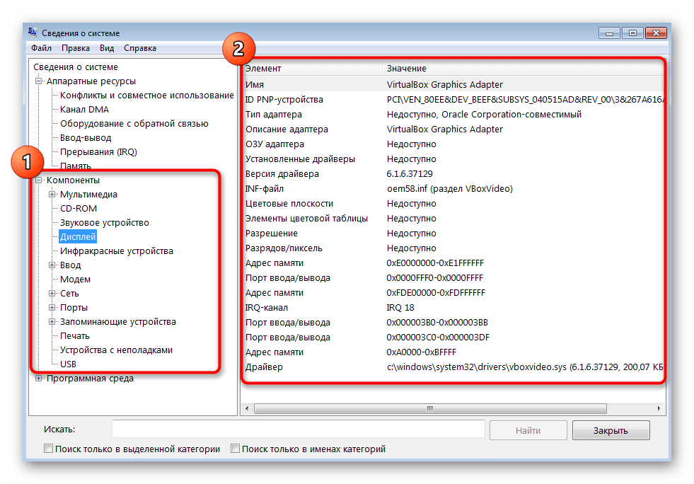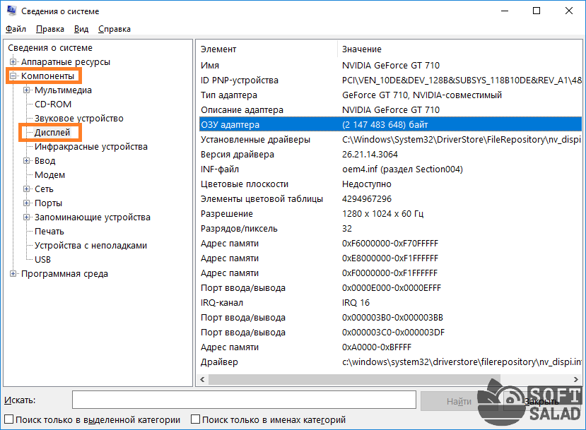 Если речь идет о простом определении железа, то тогда следует обратиться в раздел «Компоненты» и выбрать там подходящую категорию. В правой части экрана отобразятся все сведения об элементе, например, видеокарте. Вы получите не только ее наименование, но и ID, версию драйвера, связанные файлы, количество оперативной памяти и используемые порты.