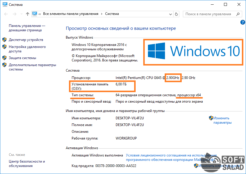 В пункте «Процессор» показана модель и частота ЦП. Ниже отображен объем оперативной памяти и разрядность ОС.