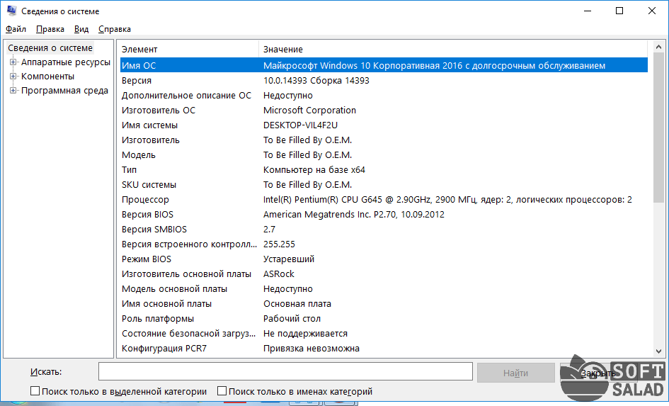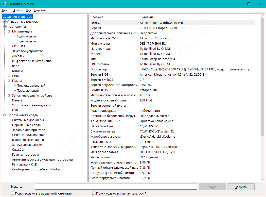 «Сведения о системе» позволяют посмотреть множество информации о Вашем компьютере и системе. Основная информация находится во вкладке «Сведения о системе», данные об оборудовании в «Компоненты», а подробные сведения о системе в «Программная среда».